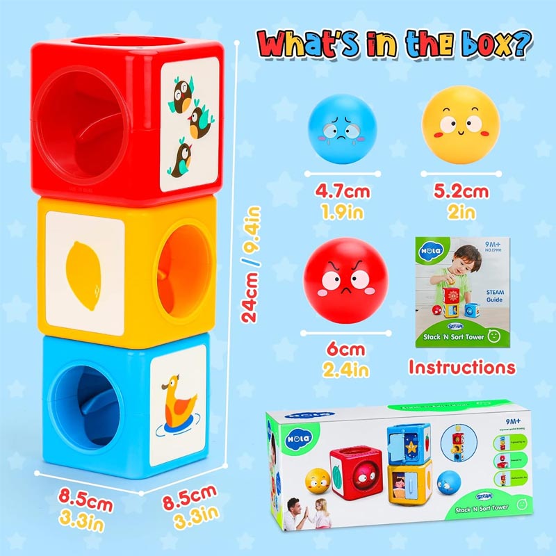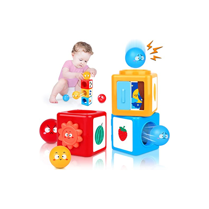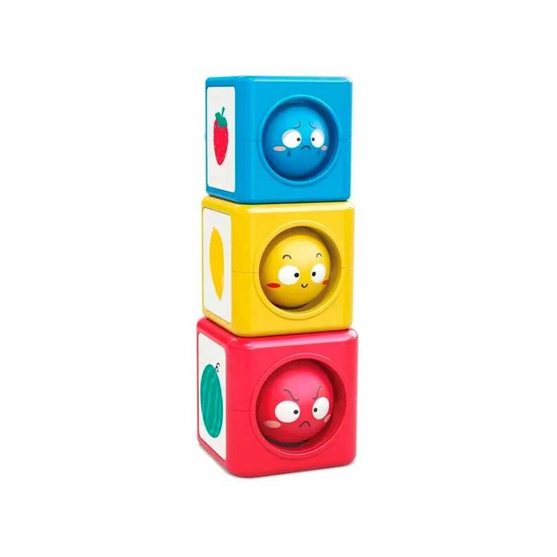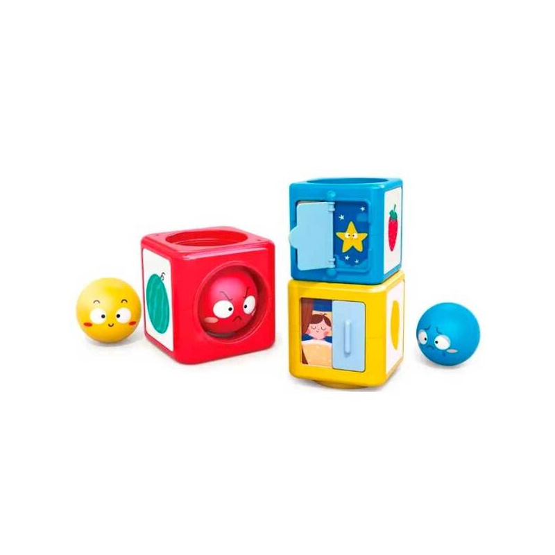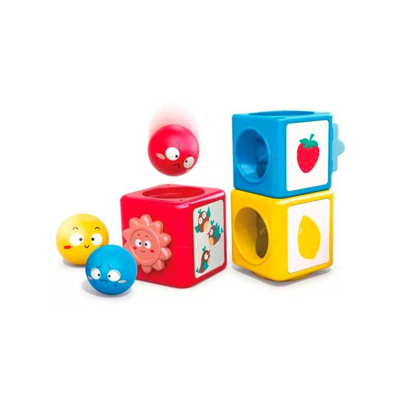- مرتبسازی و اندازهها: مجموعه شامل ۳ مکعب و ۳ توپ رنگی جغجغهای است که قطرهای متفاوتی دارند. کودک باید توپ همرنگ و هماندازه را از حفرهی مکعب مربوطه عبور دهد، که به درک مفهوم مرتبسازی و اندازهها کمک میکند.