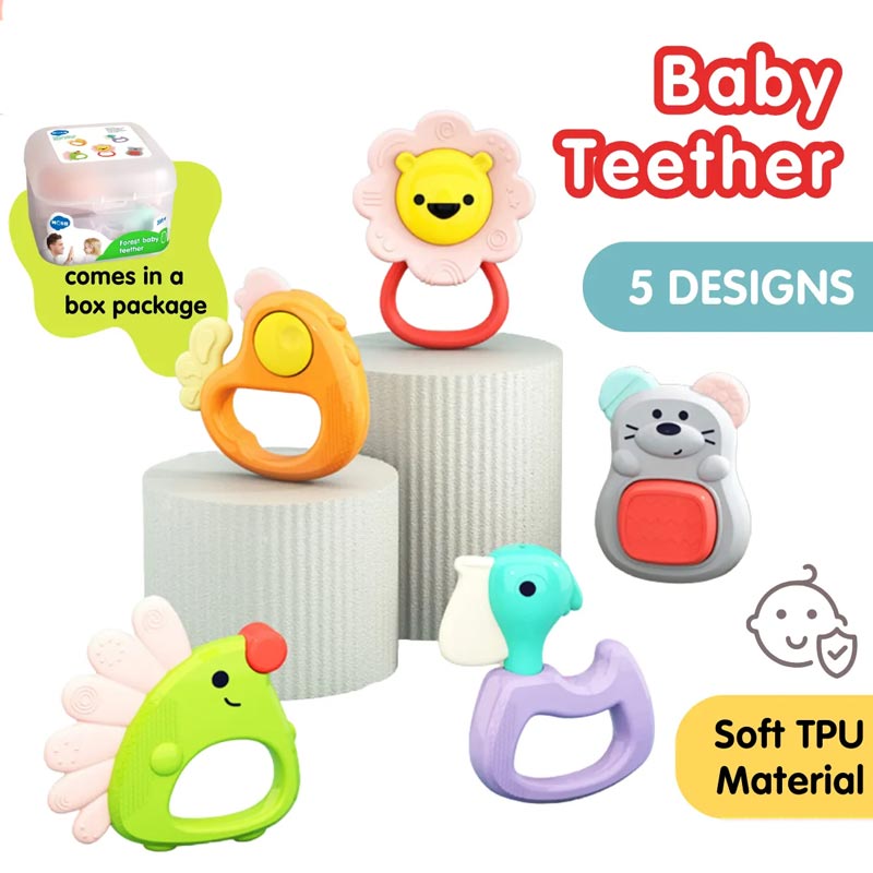 ست ۵ عددی جغجغه و دندانگیر کودک طرح حیوانات یک محصول ضروری و چندمنظوره برای سیسمونی نوزادان بالای ۳ ماه است. این ست با طراحی جذاب و استفاده از ۵ مدل حیوان جنگلی، به‌طور همزمان دو نیاز حیاتی کودک در این سن را برطرف می‌کند: تسکین درد لثه در دوران دندان درآوردن و تحریک حواس از طریق جغجغه و بافت‌های مختلف.