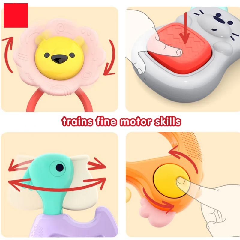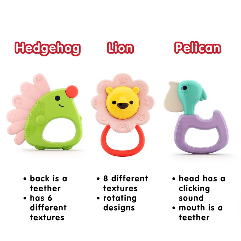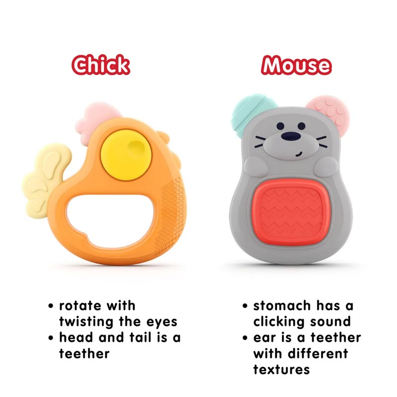 • جغجغه تعاملی: قطعات در این مجموعه فقط دندانگیر نیستند؛ برخی از آن‌ها هنگام تکان دادن صدای جغجغه تولید می‌کنند یا دارای بخش‌هایی هستند که کلیک می‌کنند، می‌چرخند یا حرکت می‌کنند. این ویژگی‌ها حس شنوایی و بینایی کودک را به‌طور مؤثری تحریک می‌کند.