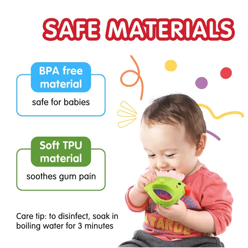 • رنگ‌های جذاب و ایمن: استفاده از رنگ‌های شاد و غیرشیمیایی، ضمن تحریک بینایی، کاملاً ایمن بوده و در تماس با دهان نوزاد خطرآفرین نیست.